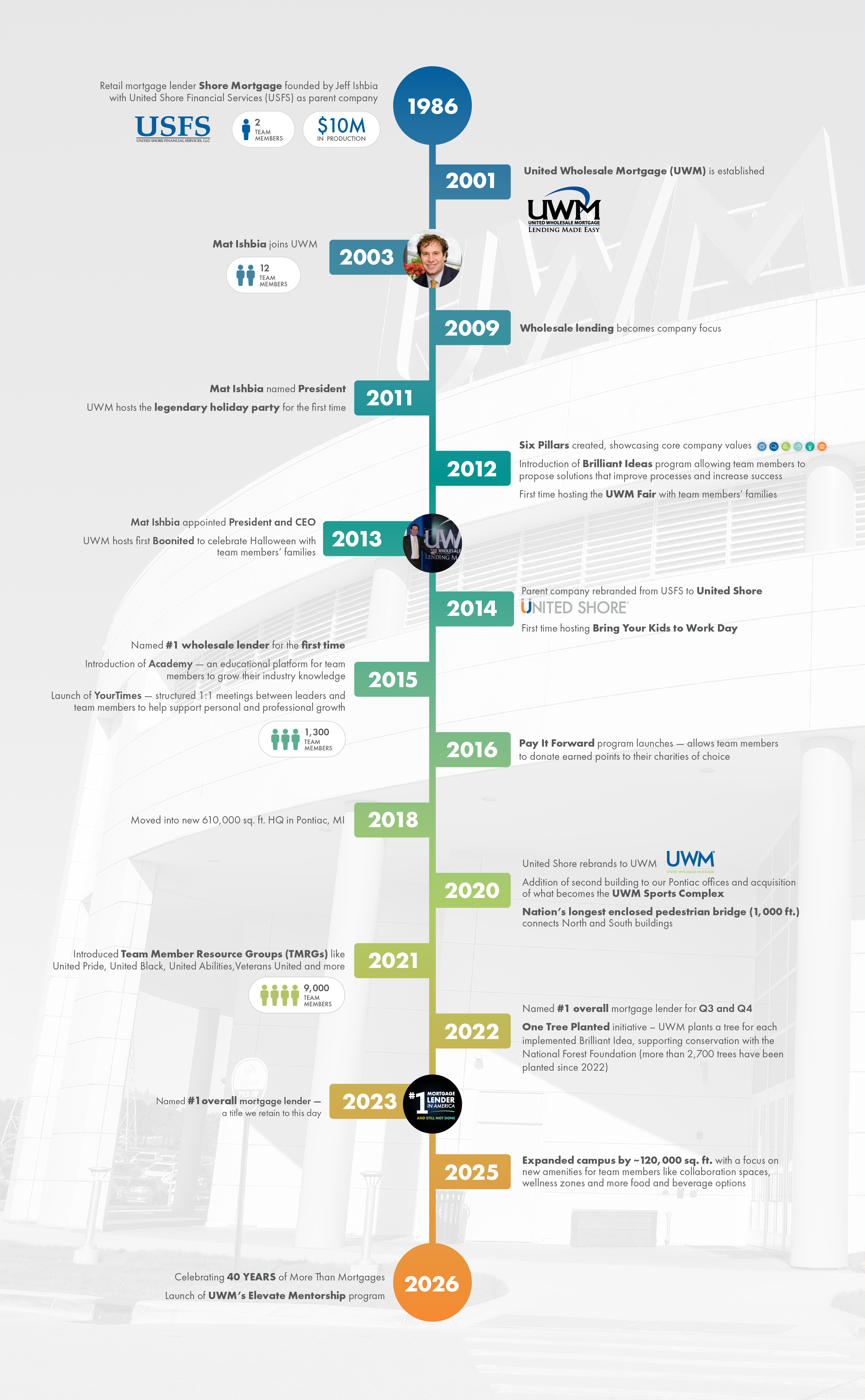 Our Pontiac campus supports thousands of dedicated team members, all working together to help our mortgage broker partners make dreams come true for homeowners everywhere. From our inspiring leadership team to our inclusivity experts and award-winning training programs, UWM has helped thousands grow and establish themselves, and we will continue to do so for the next 40 years.